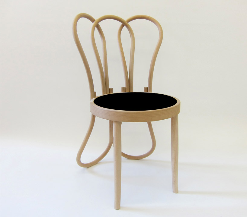 La sedia, ideata da Martino Gamper nel 2012, entra oggi a far parte della collezione Wiener GTV design. Ironia e leggerezza trasformano le gambe e lo schienale in elementi simmetrici in costante dialogo con la tradizione: un gioco di specchi che moltiplica le forme producendo una sorta di eco visivo che ha per protagonista il legno curvato.