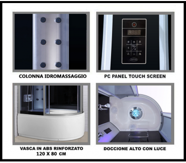 Cabina idromassaggio di ultima generazione. Modello Connect con collegamento Bluetooth. Supreme Luxus. Prodotto hi-tech, con le dovute certificazioni UE. Con vasca incorporata. Comprensiva di collegamento Bluetooth. Modello DOROTHY.Struttura molto capiente, spaziosa ed innovativa. Le misure sono le seguenti:- 120 cm larghezza;- 80 cm profondità;- 215 cm altezza; Il pannello di controllo digitale touchscreen, la chiusura delle porte magnetica, le rifiniture in alluminio satinato, il vetro temperato ed oscurato da 6,5 mm anti infortunio, il doccione superiore illuminato, la cromoterapia a 7 colori, l’ozonoterapia, il massaggio plantare, l’apparecchiatura telefonica in vivavoce, collegamento Bluetooth la radio FM e la predisposizione per i compact disc sono alcune delle spettacolari funzionalità che contraddistinguono questa cabina. Garanzia di 24 mesi, siamo power seller platinum, leader nella qualità e nei prezzi. Prezzo incredibile. Prezzo negozio circa 2600,00 euro.Visitate il nostro negozio Arredocasafacile.itProdotto ordinato su richiesta al produttore, pensato e progettato per i clienti più esigenti che richiedono il massimo del comfort e della tecnologia. Le spedizioni verranno effettuate tramite corriere espresso, rapidissime nella consegna, due-tre giorni lavorativi.. Spedizione iva inclusa, con possibilità dell’Iva agevolata al 4% per prima casa o 10% per ristrutturazione, diversamente l’iva sarà quella ordinaria con aliquota del 22%.Alla fine dell’acquisto contattaci per avere il modulo richiesta Iva. Caratteristiche tecniche:- Touch screen computer panel;- Bluetooth – FM radio;- Ozono terapia; – Piatto doccia in ABS rinforzato a tre strati in resina con telaio zincato;- Doccione nel tetto con illuminazione, doccia in acciaio cromato;- Cromoterpia con luce a 7 colori; – Colonne in alluminio satinato;- Maniglie Cromate;- Mensola di vetro;- Porta asciugamano;- Specchio;- Getti d’acqua idromassaggio (6 posti sul pannello);- Controllo acqua calda – acqua fredda;- Poggia schiena;- Changeover switch;- Massaggio plantare (massaggio ai piedi);- Comoda seduta per sauna o idromassaggio;- Vasca antiscivolo;- Back cushion;- Dispenser sapone liquido;- Cromoterapia;- Luce in alto, led posteriori;- Ricevitore telefonico anche in vivavoce;- Scarico per l’acqua;- Ventilatore di scarico;- Altoparlanti;- Vetro temperato ed oscurato da 6,5 mm anti infortunio (ordinato appositamente).Nota bene: la nostra offerta si differenzia da altre vendite poiché compreso nel prezzo vi sono (valore di mercato di 140,00 euro per questi optional):- Bluetooth;- Ozonoterapia (generatore di ioni attivi);- Cromoterpia a 7 colori;- Sistema di sanificazione;- Jacuzzi massage;- Idrogetti lungo la colonna centrale. Imballo con cella di legno antiurto, che garantisce sicurezza nel trasporto. Si comunica che i colli che riceverete per questo tipo di prodotto sono 4 in totale per un peso complessivo di oltre 200 kg.Garanzia e assistenza 2 anni