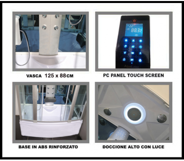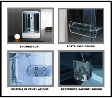 Cabina idromassaggio di ultima generazione. Supreme Luxus. Prodotto hi-tech, con le dovute certificazioni UE. Con vasca incorporata. Modello “Artemide”.Struttura spaziosa, capiente ed innovativa. Le misure sono le seguenti:- 125 cm larghezza;- 88 cm profondità;- 216 cm altezza; Il pannello di controllo digitale touchscreen, la chiusura delle porte magnetica, le rifiniture in alluminio satinato, il vetro temperato ed oscurato da 6,5 mm anti infortunio, il doccione superiore illuminato, il massaggio plantare, l’apparecchiatura telefonica in vivavoce, la radio FM e la predisposizione per i compact disc sono alcune delle spettacolari funzionalità che contraddistinguono questa cabina. Garanzia di 24 mesi, siamo power seller platinum, leader nella qualità e nei prezzi. Prezzo incredibile. Prezzo negozio circa 2600,00 euro.Visitate il nostro negozio Arredocasafacile.itProdotto ordinato su richiesta al produttore, pensato e progettato per i clienti più esigenti che richiedono il massimo del comfort e della tecnologia. Spedizioni tramite corriere espresso, rapidissime, due-tre giorni lavorativi. Iva non inclusa nel prezzo. Spedizione iva inclusa. Possibilità di Iva agevolata al 4% per prima casa o 10% per ristrutturazione, diversamente l’iva sarà quella ordinaria con aliquota del 22%. Alla fine dell’acquisto contattaci per avere il modulo richiesta Iva. Caratteristiche tecniche:- Touch screen computer panel;- FM radio;- Piatto doccia in ABS rinforzato a tre strati in resina;- Doccione nel tetto con illuminazione, doccia in acciaio cromato;- Colonne in alluminio satinato;- Maniglie Cromate;- Mensola di vetro;- Porta asciugamano;- Specchio;- Getti d’acqua idromassaggio (6 posti sul pannello);- Controllo acqua calda – acqua fredda;- Poggia schiena;- Changeover switch (miscelatore termostatico);- Massaggio plantare (massaggio ai piedi);- Comoda seduta- Vasca antiscivolo;- Back cushion;- Dispenser sapone liquido;- Cromoterapia;- Luce in alto, led posteriori;- Ricevitore telefonico anche in vivavoce;- Scarico per l’acqua;- Ventilatore di scarico;- Altoparlanti;- Vetro temperato ed oscurato da 6,5 mm anti infortunio (ordinato appositamente).Nota bene: la nostra offerta si differenzia da altre vendite poiché compreso nel prezzo vi sono (valore di mercato di 370,00 euro per questi optional):- Ozonoterapia (generatore di ioni attivi);- Jacuzzi massage;- Idrogetti lungo la colonna centrale. Imballo con cella di legno antiurto, che garantisce sicurezza nel trasporto. Si comunica che i colli che riceverete per questo tipo di prodotto sono 4 in totale per un peso complessivo di oltre 200 kg.Garanzia e assistenza 2 anni