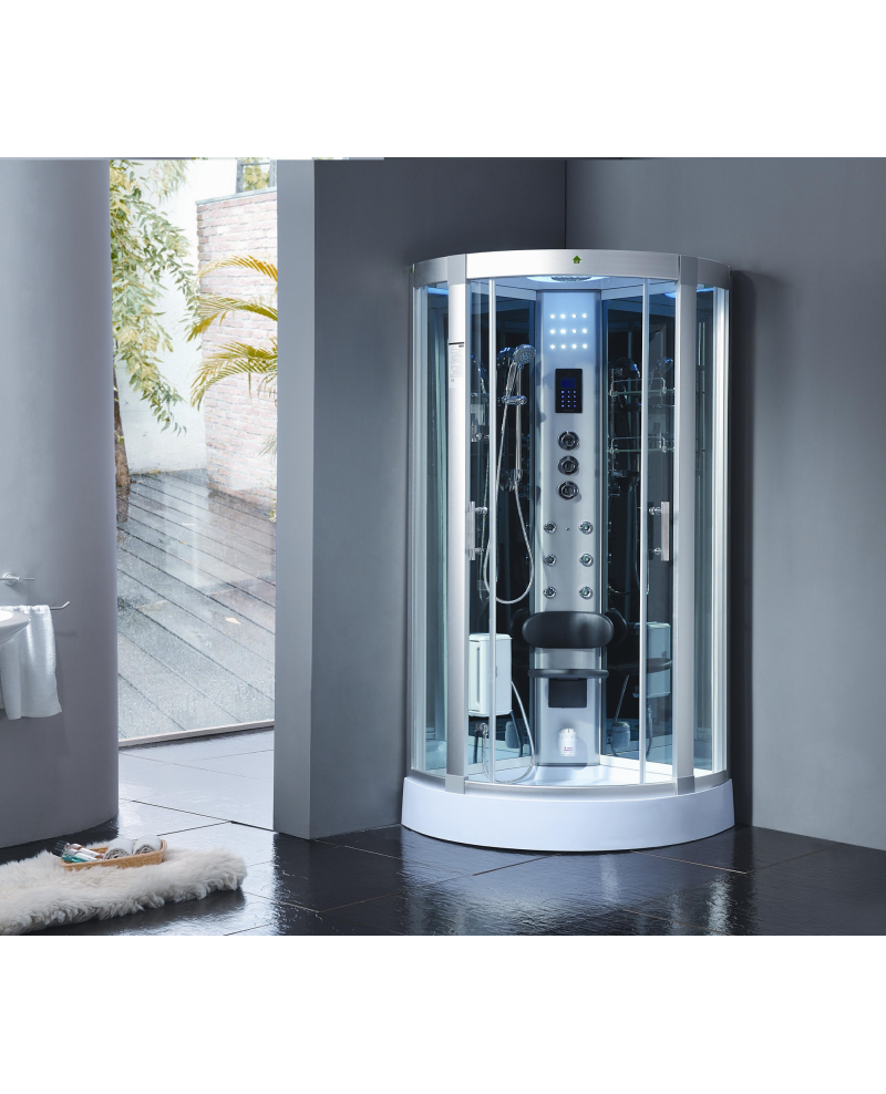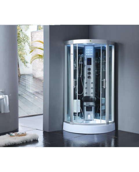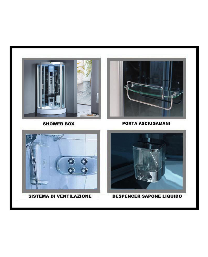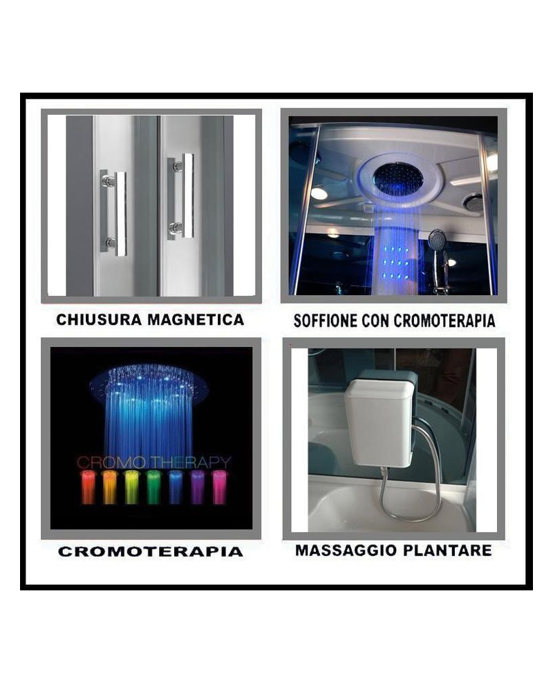 Il pannello di controllo digitale touchscreen, la chiusura delle porte magnetica, le rifiniture in alluminio satinato, il vetro temperato ed oscurato da 6,5 mm anti infortunio, il doccione superiore illuminato, il massaggio plantare, la sauna, l’apparecchiatura telefonica in vivavoce, il Bluetooth, la radio FM e la predisposizione per i compact disc sono alcune delle spettacolari funzionalità che contraddistinguono questa cabina.