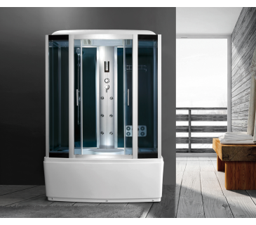 Cabina Idromassaggio di ultima generazione con Vasca Idromassaggio incorporata, misure 150×88, con Bagno Turco, Sauna, Cromoterapia, Ozonoterapia, Vetro Temperato Oscurato da 6,5mm, Massaggio Plantare, Telefono con Vivavoce e collegamento Bluetooth.