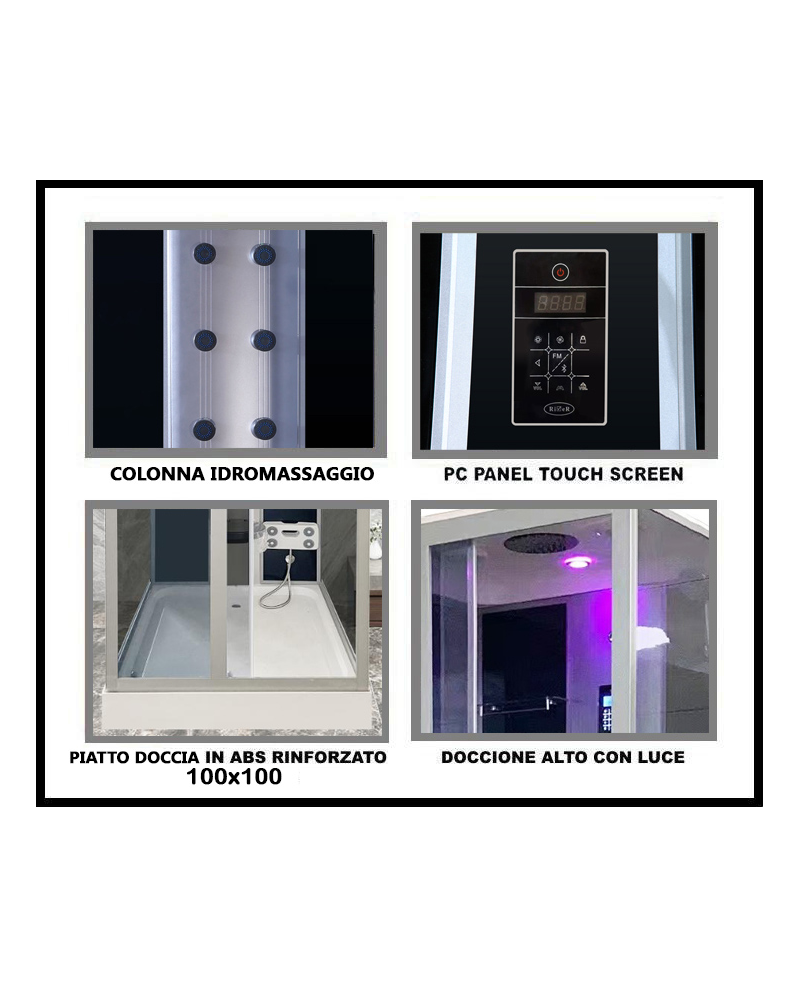 Cabina Idromassaggio Hi Tech, con Cromoterapia, Ozonoterapia, Vetro Temperato Oscurato da 6,5mm, PC Panel Touch Screen, Collegamento Bluetooth di ultima generazione, misure 100×100.