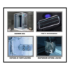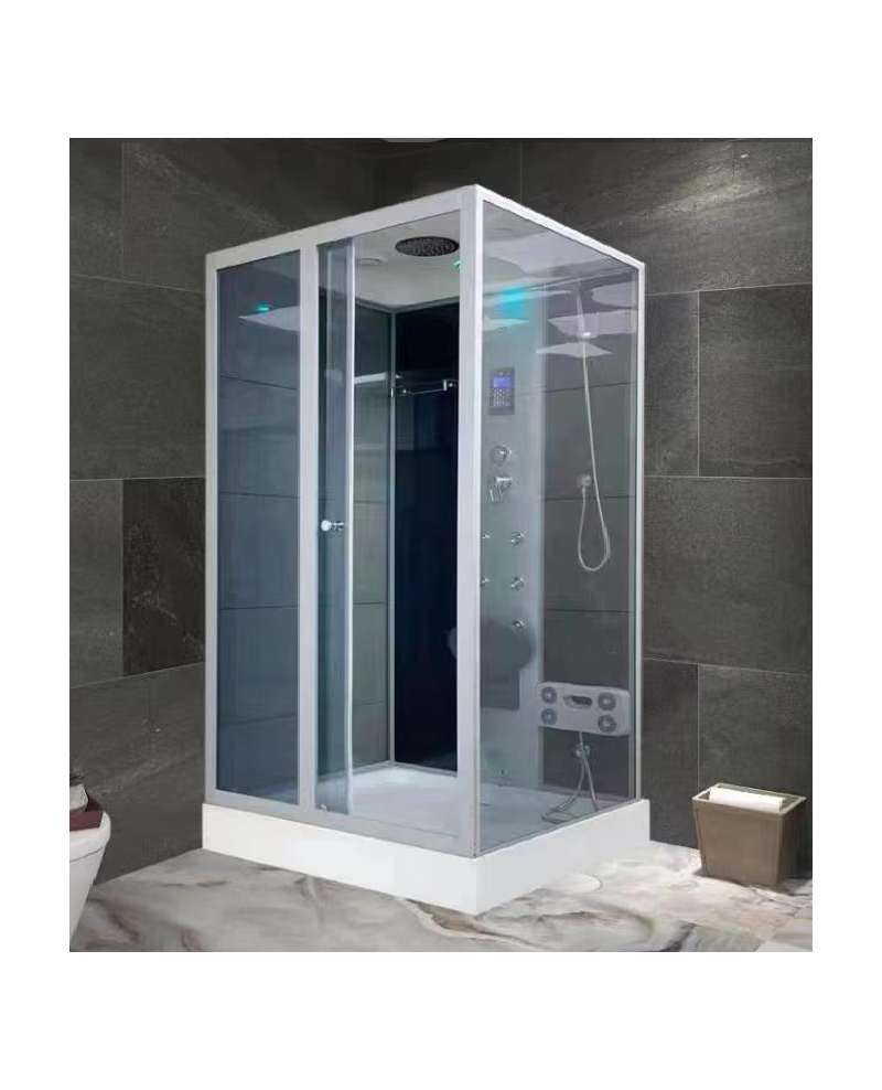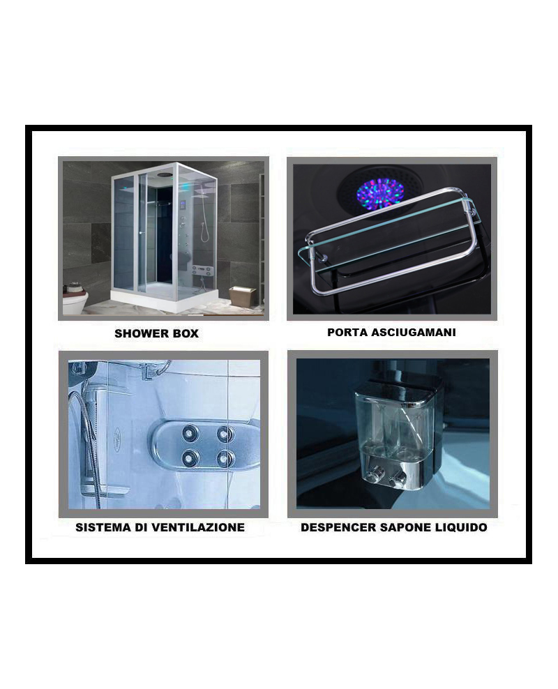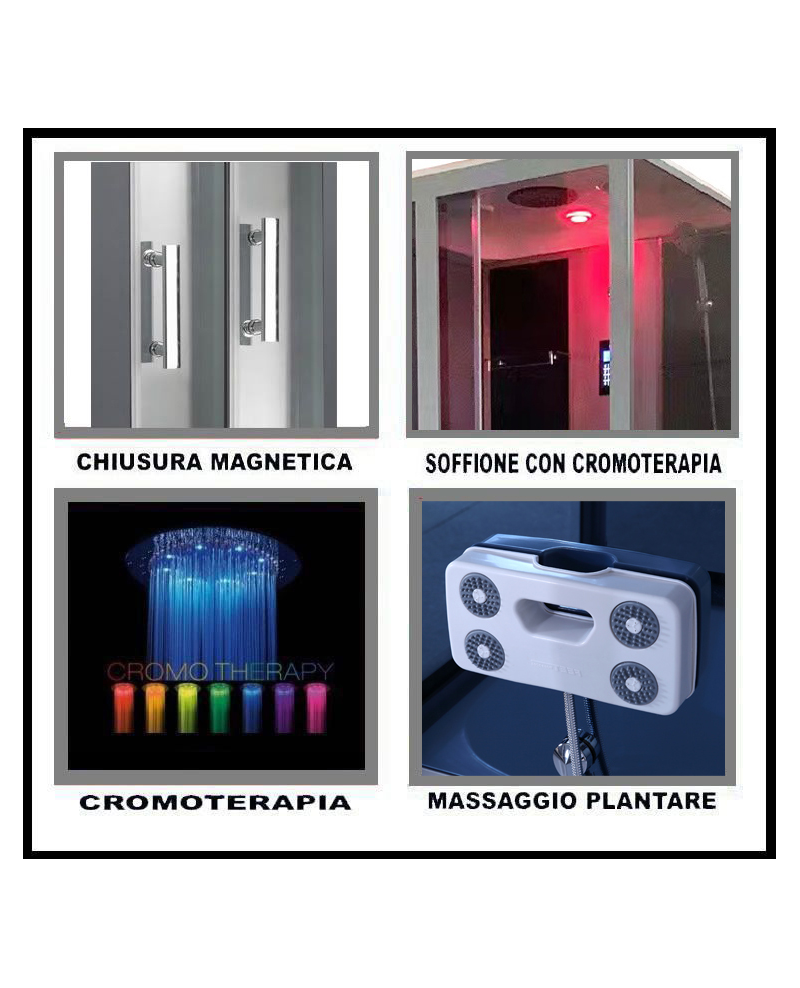 Pannello di controllo digitale touchscreen, chiusura delle porte magnetica, rifiniture in alluminio satinato, vetro temperato ed oscurato da 6,5 mm anti infortunio, doccione superiore illuminato, cromoterapia a 7 colori, ozonoterapia, massaggio plantare, apparecchiatura telefonica in vivavoce, collegamento Bluetooth con radio FM. Queste sono alcune delle spettacolari funzionalità che contraddistinguono questa cabina.