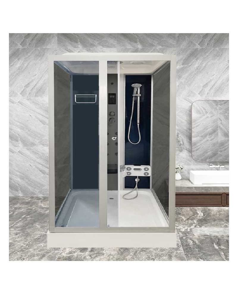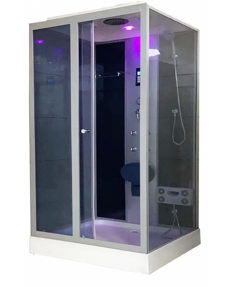 Il pannello di controllo digitale touchscreen, la chiusura delle porte magnetica, le rifiniture in alluminio satinato, il vetro temperato ed oscurato da 6,5 mm anti infortunio, il doccione superiore illuminato, la cromoterapia a 7 colori, l’ozonoterapia, il massaggio plantare, l’apparecchiatura telefonica in vivavoce, collegamento Bluetooth la radio FM e la predisposizione per i compact disc sono alcune delle spettacolari funzionalità che contraddistinguono questa cabina.