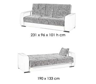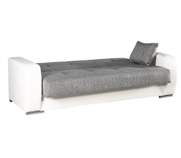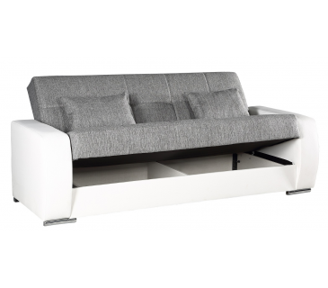 Divano Letto Reclinabile Contenitore. in Ecopelle / Microfibra di Alta qualità, colore Bianco / Grigio, tre posti a sedere, Letto aperto matrimoniale da 2 piazze con sistema antiribaltamento, comprensivo di Cuscini. Piedini Rinforzati.Dotato di vano contenitore