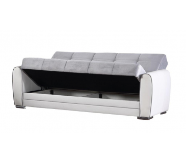 Divano Letto Reclinabile Contenitore. in Ecopelle / Microfibra effetto Nabuk di Alta qualità, colore Bianco / Grigio, tre posti a sedere, Letto aperto da una piazza e 1/2 con sistema antiribaltamento, comprensivo di Cuscini. Piedini Rinforzati.Dotato di vano contenitore