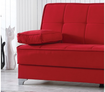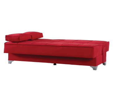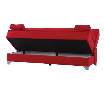 Divano Letto Reclinabile Contenitore. in Microfibra di Alta qualità, colore Rosso, tre posti a sedere, Letto aperto da una piazze e 1/2, con sistema antiribaltamento, comprensivo di Cuscini. Piedini Rinforzati. Dotato di vano contenitore