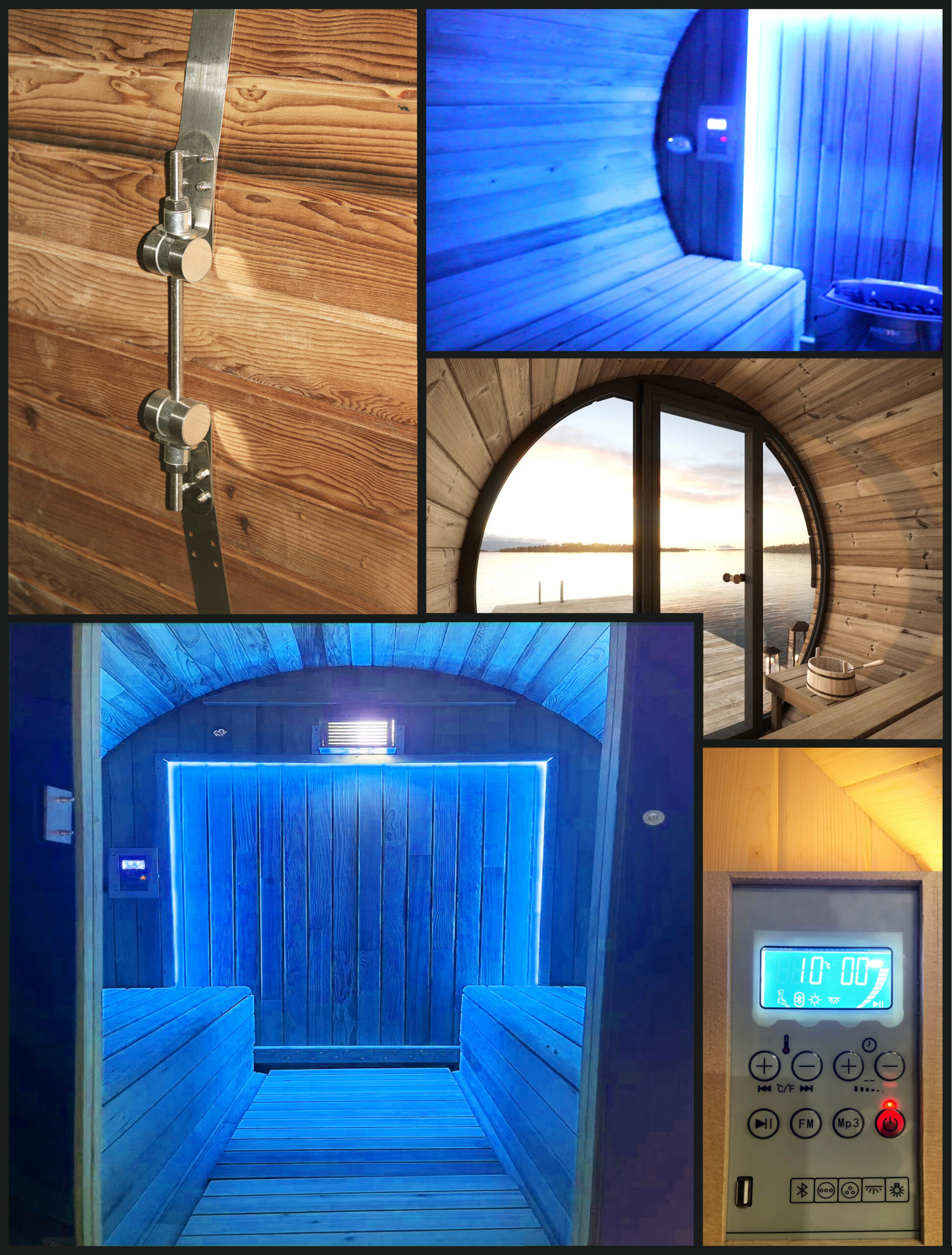 Sauna Finlandese 210×180 king size – Legno Canadese Hemlock (Conifera nordamericana). Stufa Harvia Eco-Tech. Cerniera botte in Acciaio Inox. Con Nuovo Pc – Full Optional – Luce led 7 colori – Ozono – Aromaterapia – Ventola – Luce lettura – Mp3 – Mp4 – Usb – Radio – Bluetooth – Timer – Orologio – Secchiello – Cucchiaio. Led, vetro Sky View. Fibra di vetro e copertura in asfalto ideata per spazi esterni.