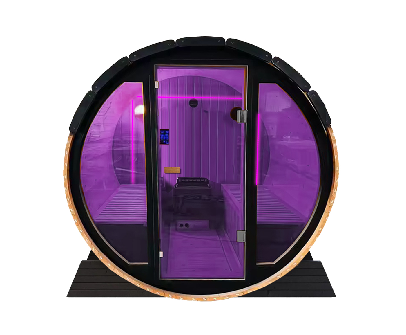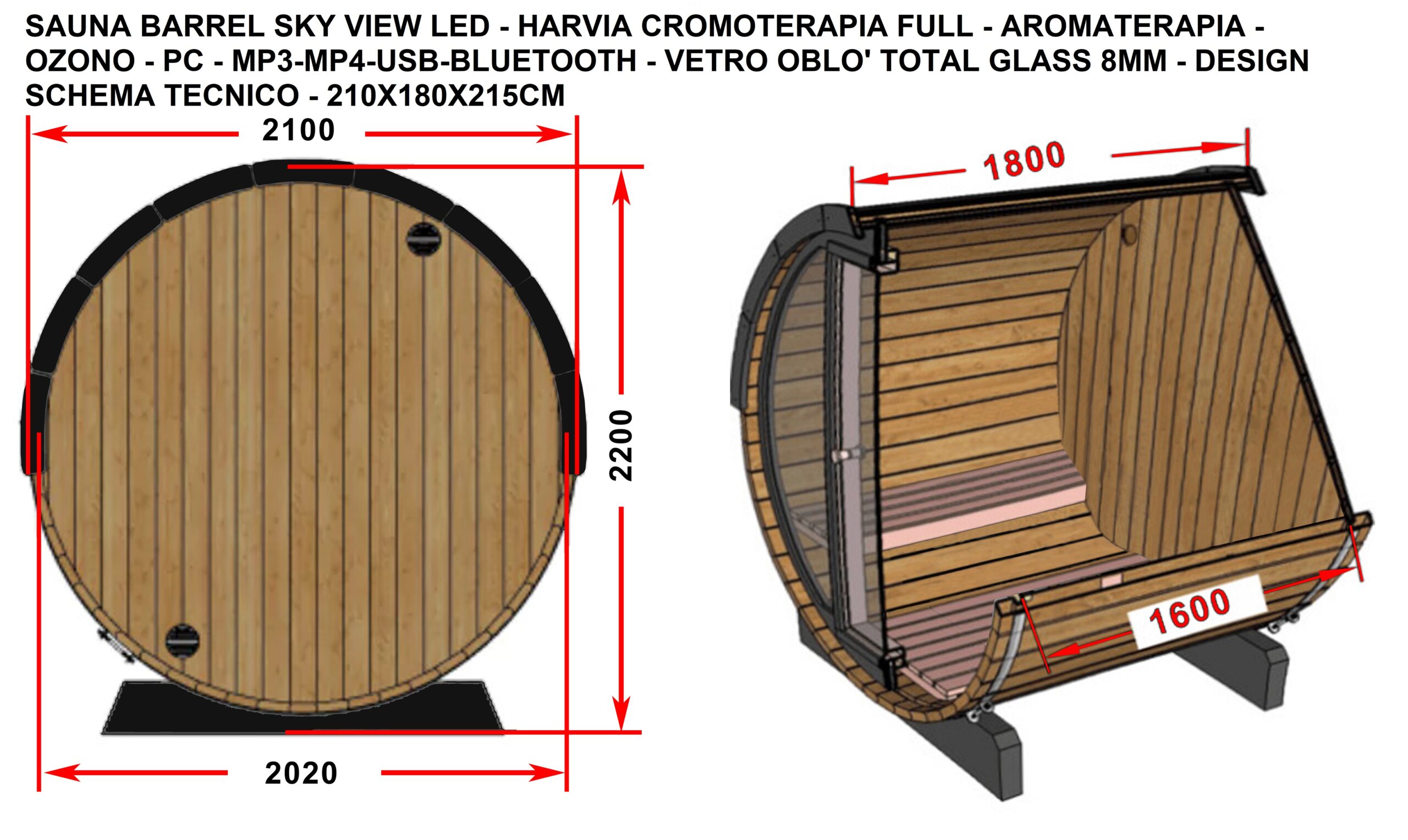 SAUNA FINLANDESE BOTTE / SAUNA BARREL. SAUNA TRADIZIONALE MULTIFUNZIONE (SKY VIEW) VETRO OBLO’ 210X180X220 CM DA 6-8 PERSONE (POSTAZIONE LOUNGE), (DIAMETRO BARREL 210CM CON CMODE PANCHE INTERNE) – NUOVO DESIGN UNICO CON INGRESSO A TUTTO VETRO MODERNO, PROFILI E MATERIALI DI ALTISSIMA QUALITA’ E RESISTENTI. MODELLO PROFESSIONALE. CON VETRO TEMPERATO DA 8MM E CERNIERE IN ACCIAIO. SAUNA FINLANDESE CON RADIO PC MP3 + MP4 + USB + OZONO + BLUETOOTH + SKY VIEW + NUOVO PC + LUCE CROMOTERAPIA A 7 COLORI LED SU PARETE DESIGN A 7 COLORI) + BASE IN FIBRA DI VETRO + TIMER E LUCE DI SERVIZIO + AROMATERAPIA + SECCHIELLO + CLESSIDRA + TIMER (MANUALE E DIGITALE) CON VETRO 8MM – STUFA HARVIA ECO-TECH DA 6KW O 9KW (A SCELTA DEL CLIENTE) CON GABBIA PROTETTIVA – VEDI SOTTO TUTTI GLI ACCESSORI – SUPER ACCESSORIATA; IL TUTTO COMPRESO NEL PREZZO (ACQUISTABILE SEPARATAMENTE COME OPTIONAL MODULO CONNESSIONE PC A STUFA PER COMUNICAZIONE AL PREZZO DI 390 EURO).