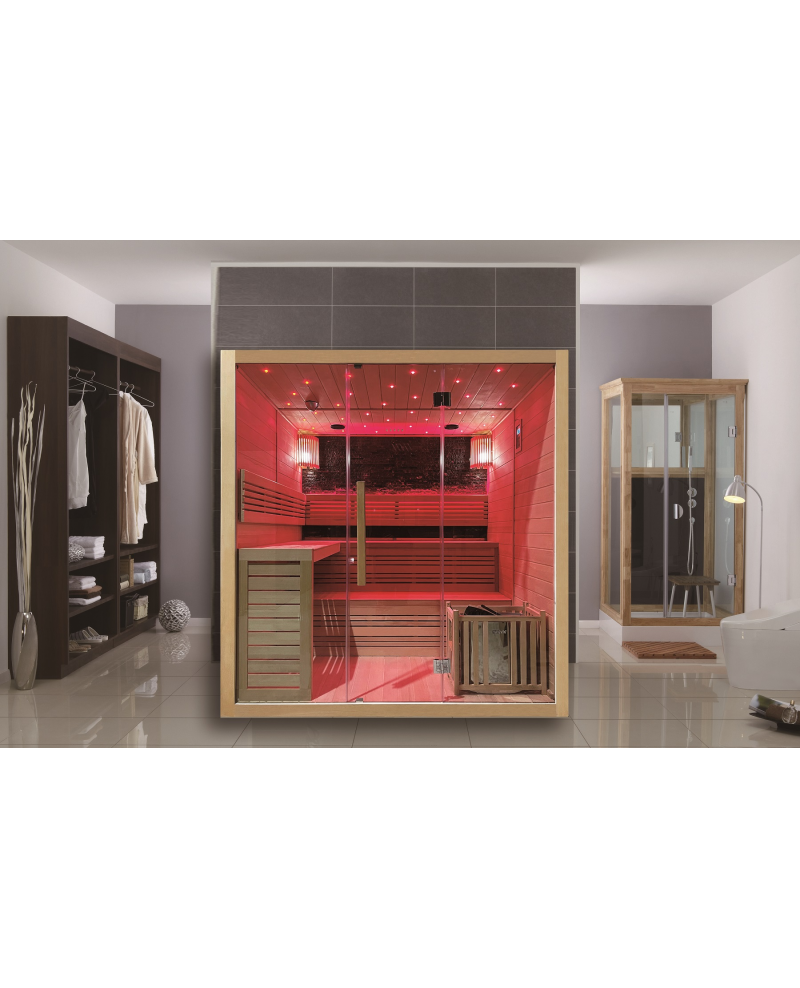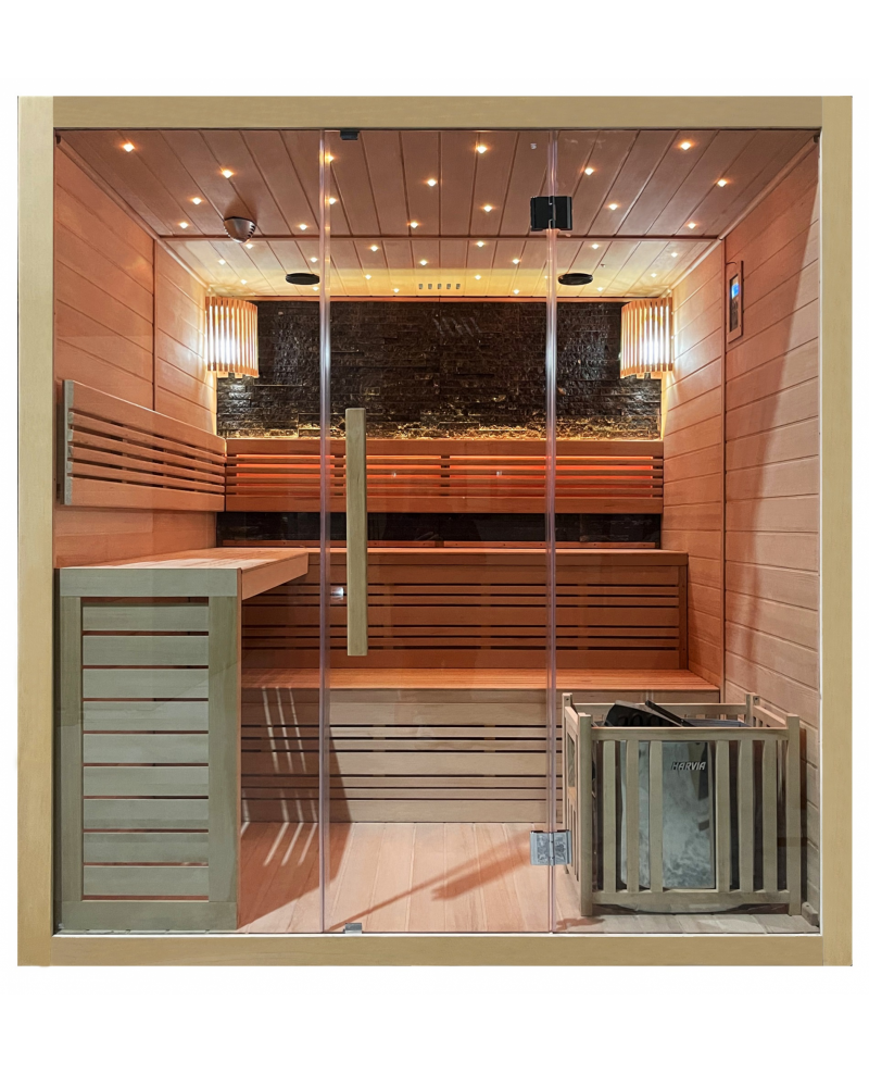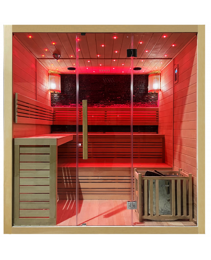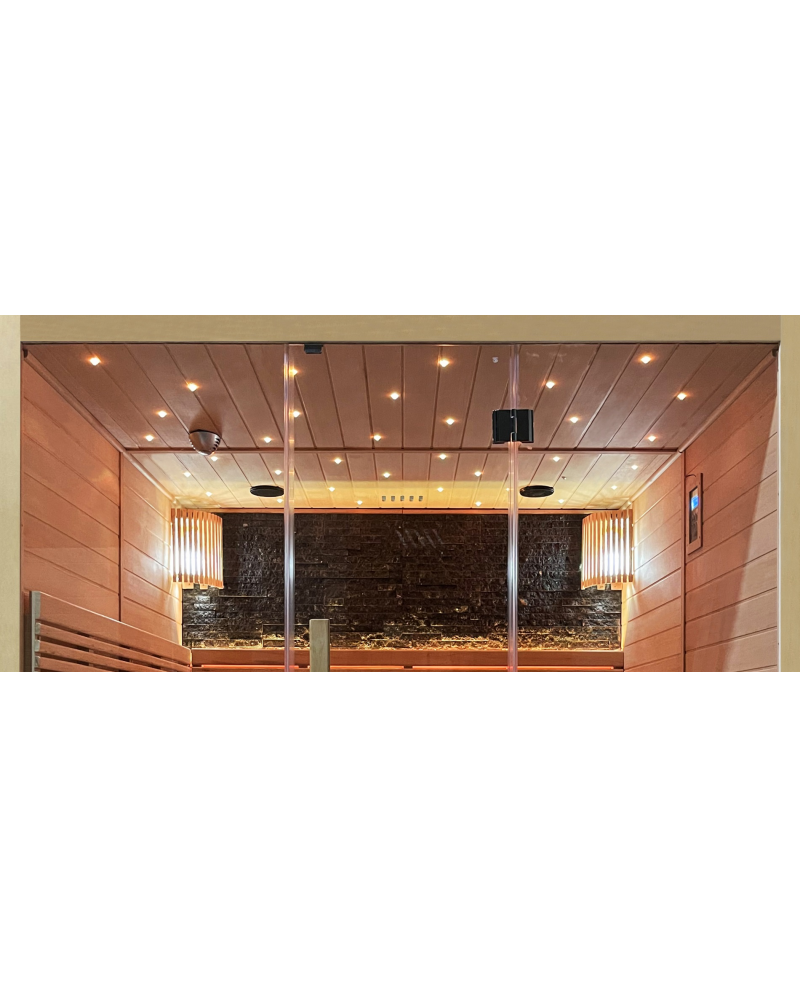 La sauna finlandese presentata, ha capienza di 5-7 persone con postazione “lounge”, con tripla panca speculare, ed è disponibile nella misura: 200x180x210cm. Viene realizzata in legno hemlock (legno Canadese), una tipologia di legno preferenziale per la costruzione delle saune. La stufa Harvia porta al raggiungimento di una temperatura di 90° a calore secco, e la cabina sauna è in grado di isolare il calore attraverso delle pareti con coibentazione e del vetro temperato di spessore 8 millimetri. La potenza della cabina da 200×180 è di 9 kw eco-tech Stufa harvia a pietra).