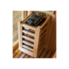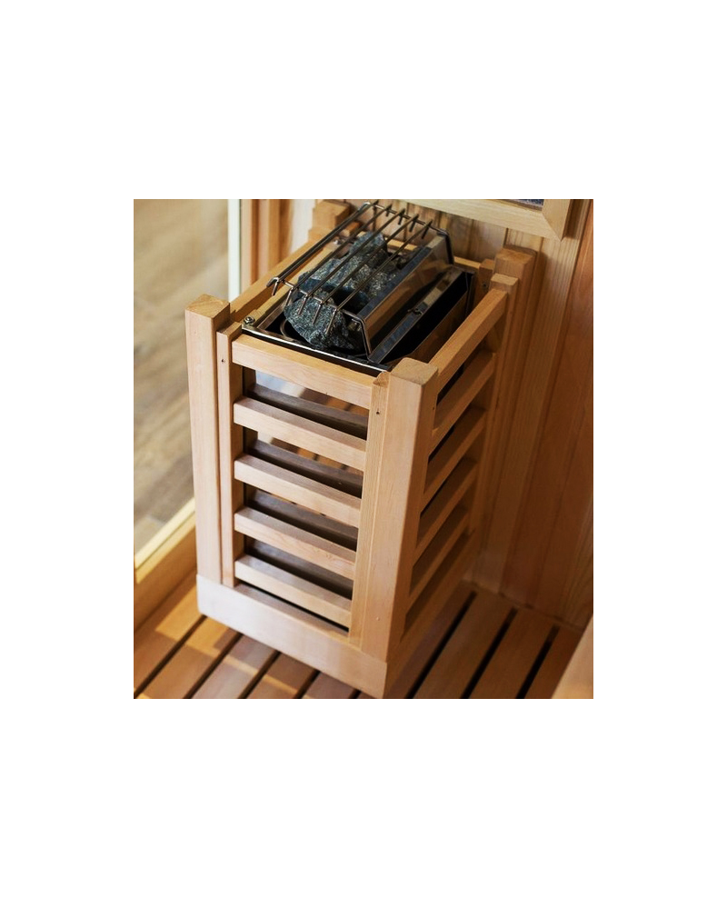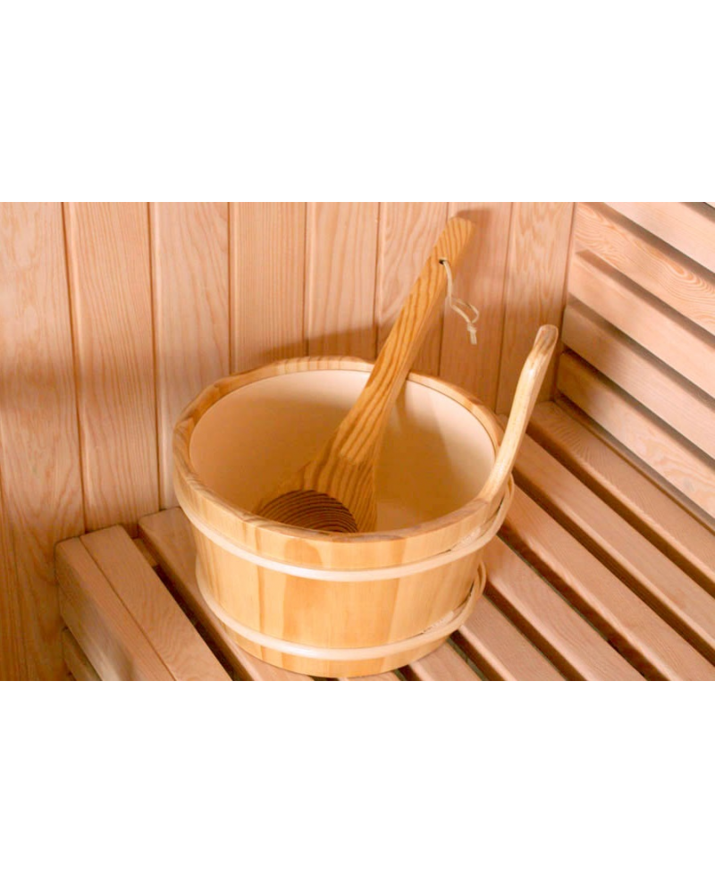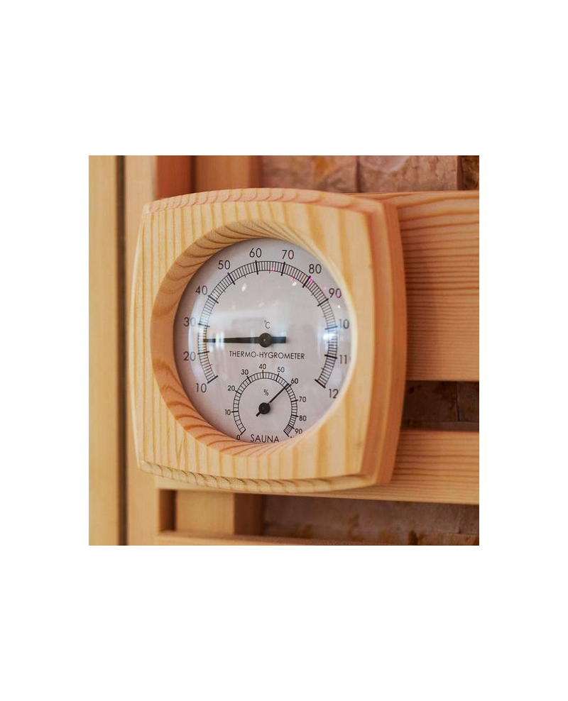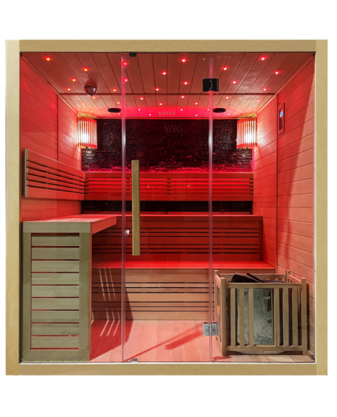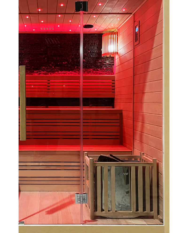 La sauna finlandese presentata, ha capienza di 5-7 persone con postazione “lounge”, con tripla panca speculare, ed è disponibile nella misura: 200x180x210cm. Viene realizzata in legno hemlock (legno Canadese), una tipologia di legno preferenziale per la costruzione delle saune. La stufa Harvia porta al raggiungimento di una temperatura di 90° a calore secco, e la cabina sauna è in grado di isolare il calore attraverso delle pareti con coibentazione e del vetro temperato di spessore 8 millimetri. La potenza della cabina da 200×180 è di 9 kw eco-tech Stufa harvia a pietra).