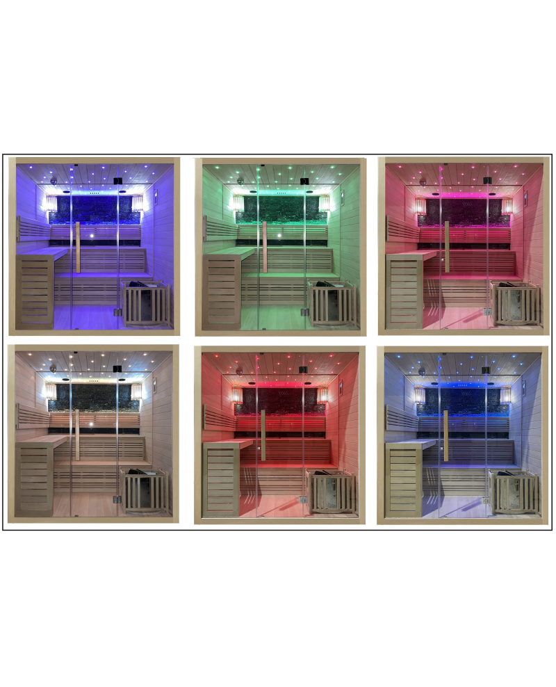 SAUNA FINLANDESE TRADIZIONALE MULTIFUNZIONE 200X180X210CM DA 5-7 PERSONE (POSTAZIONE LOUNGE) – NUOVO DESIGN UNICO CON VETRO TEMPERATO DA 8MM E CERNIERE IN ACCIAIO. SAUNA FINLANDESE CON RADIO PC MP3 + MP4 + USB + OZONO + BLUETOOTH + VENTILAZIONE + DOPPIO PC + LUCE CROMOTERAPIA A 7 COLORI (SKY STAR DESIGN / CIELO STELLATO) + MOSAICO + TIMER E LUCE DI SERVIZIO + AROMATERAPIA + SECCHIELLO + CLESSIDRA + TIMER (MANUALE E DIGITALE) CON VETRO 8MM – STUFA HARVIA ECO-TECH DA 9KW – VEDI SOTTO TUTTI GLI ACCESSORI – SUPER ACCESSORIATA;